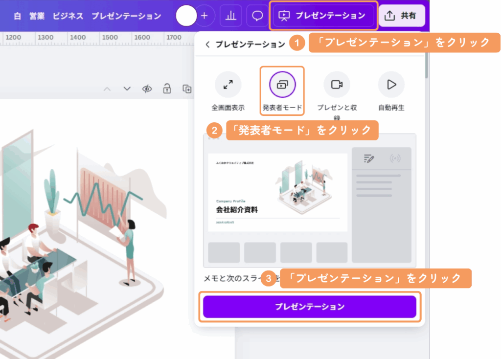 - 「発表者モード」をクリック