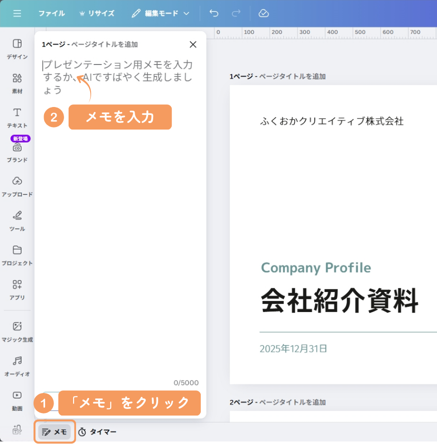 - 「メモ」をクリック