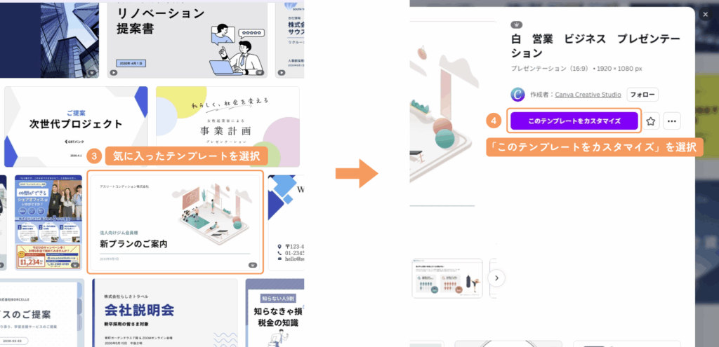 Canvaでは、プレゼン用、企画書用、社内報告用など、目的に合わせたテンプレートが豊富に揃っています。
