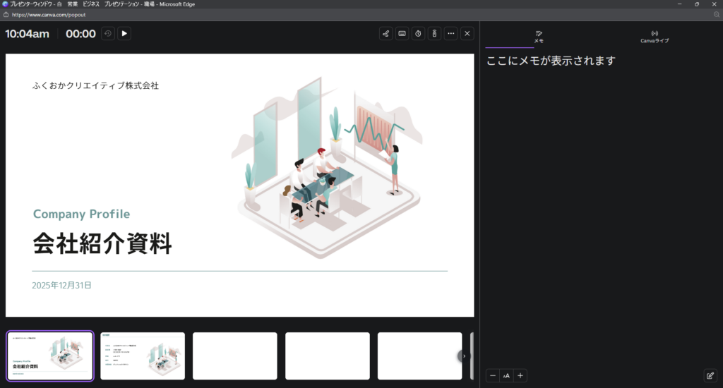 スライドを見せながら、自分のメモを同時に確認できるモードです。